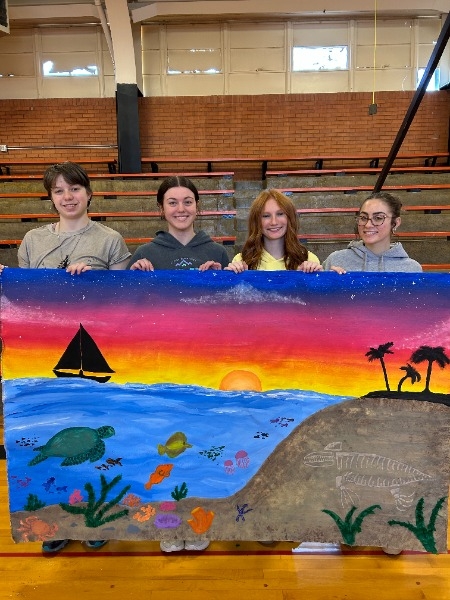 Hoxie High School art students Kyra Reuber, Coryn Nye, Lillie Denio, and Helaina Heskett traveled to Ellis for the annual Mid-Continent League Paint-In. The theme this year was "Nature." Hoxie placed second scoring high in creativity, color, and collaboration. Placing third was Russell, and first went to Smith Center. Congratulations girls!