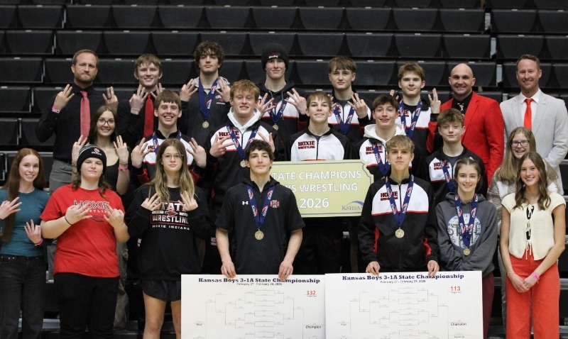 The Hoxie Indian boys wrestling team won their sixth consecutive state championship title in Hays this past weekend on February 28. The Indians brought eleven wrestlers to compete in the tournament, with ten of them placing in the top six. Qualifiers included freshmen Porter Meyer and Simon Watkins, sophomores Beau Koster, Bradyn Wilson, Carter Giancola, Noah Nickelson, and Travis Johnson, juniors Chase Meyer, Gunner Wente, Mathew Bretz, and senior Ian Giancola. As a team, the boys won the tournament, outscoring second place by 97.5 points. Both Bradyn Wilson and Ian Giancola took first place in their individual brackets without losing a match in the tournament. Carter Giancola and Travis Johnson both had a record of 3-1 on the weekend and earned second place in their weight class. Beau Koster took third place in the tournament with a final record of 4-1, and Porter Meyer, Noah Nickelson, and Chase Meyer all finished the tournament in fourth place with records of 3-2. Simon Watkins and Mathew Bretz rounded out the tournament in sixth place, and they both had records of 3-3. Gunner Wente wrestled hard and earned his team points, but did not place. “I thought everybody wrestled very well and keeping the streak of winning six team titles feels good,” said Ian Giancola. “I couldn’t be more proud of this team.”